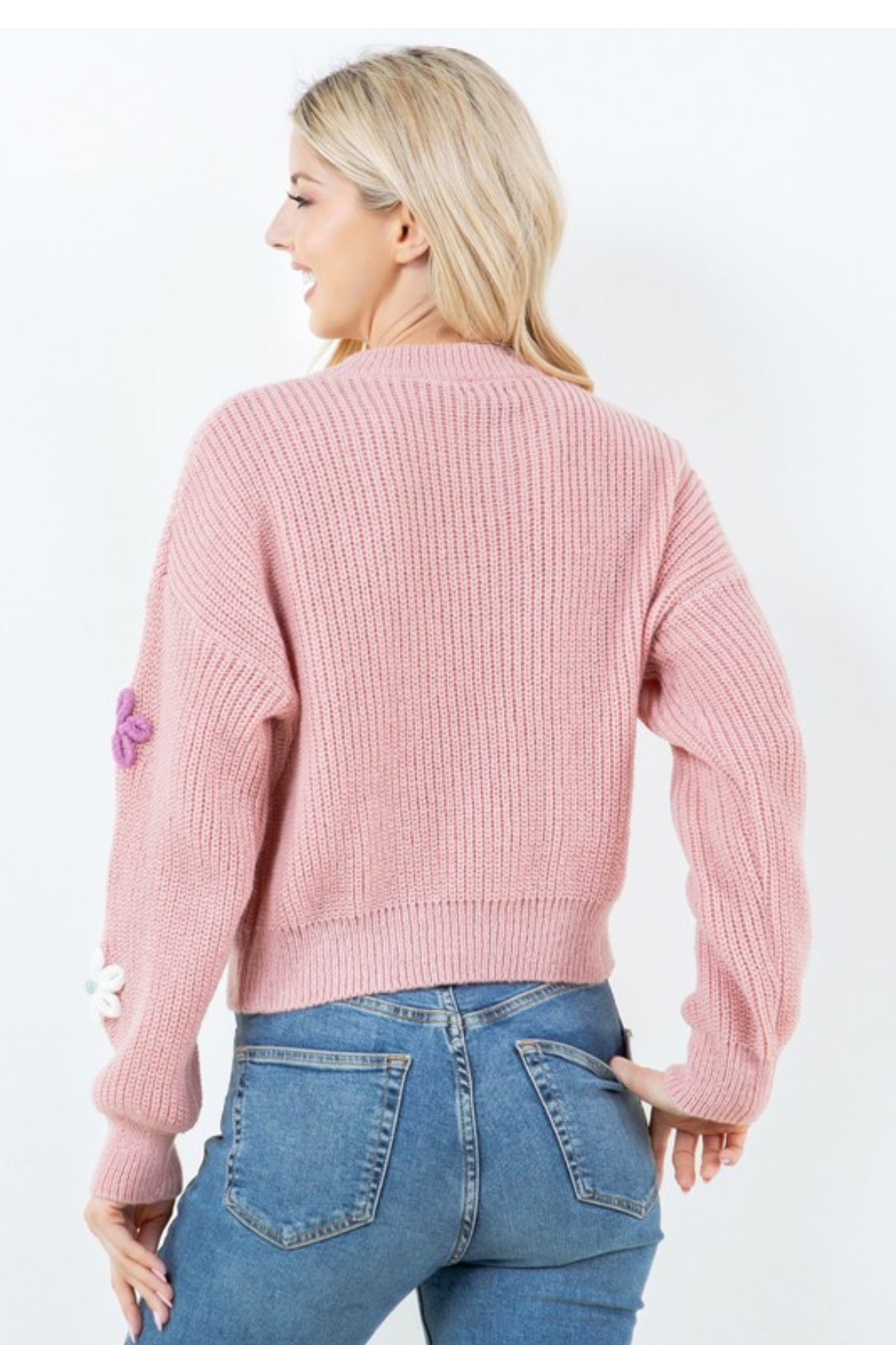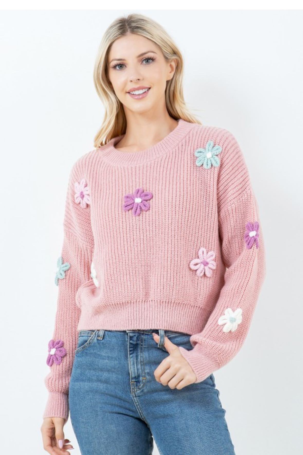 Suéter tejido en tono rosa con aplicaciones de flores en relieve en varios colores. Un diseño dulce y divertido que aporta textura y un toque femenino a cualquier outfit.